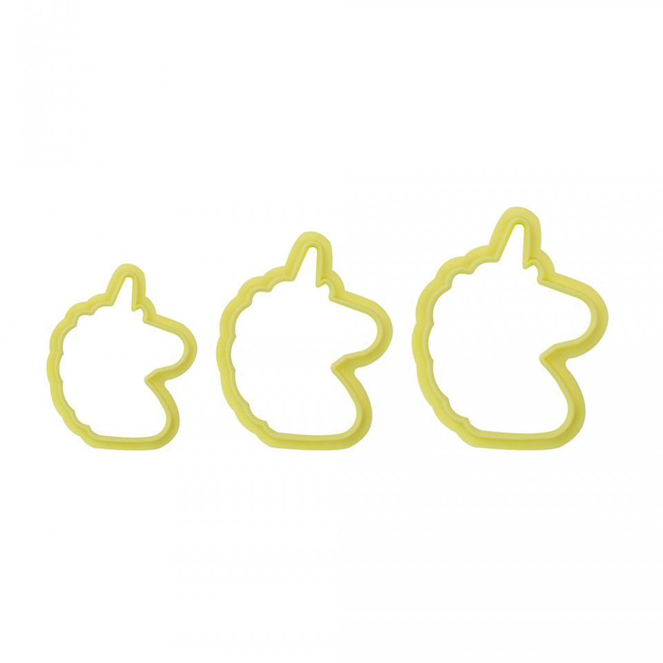 Com este cortador você poderá fazer perfeitamente a silhuteta de um unicónio. São três tamanhos para você abusar das confecções para bolos, doces, velas, chaveios, apliques e muito mais!