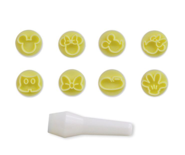 Quantidade do Kit: 8 Carimbos e um cabo. (Rosto do Mickey, rosto da Minnie, Mickey de ladinho, Minnie de ladinho, luva, sapato, shorts e laço.)
