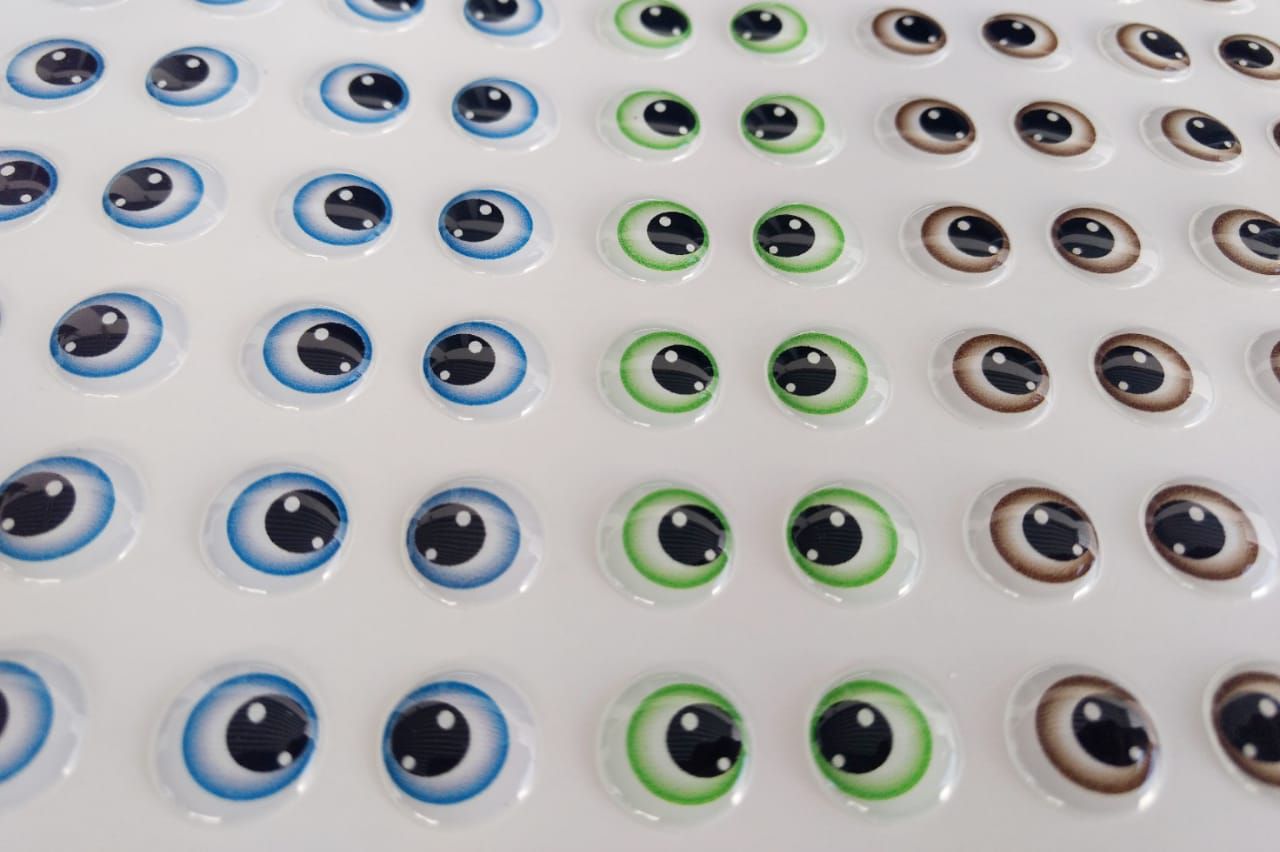 Cartela de adesivos, em material de vinil, a prova d'agua, já recortados e ideal para peças artesanais de EVA, Biscuit, papel ou tecido. São olhinhos com uma camada de resina (alto relevo que imita vidro). Cores sortidas